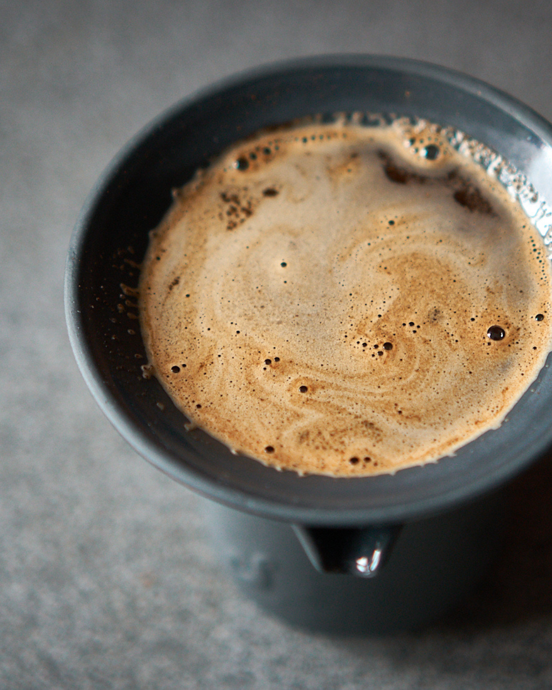 Zalej kawę gorącą wodą – powoli, równomiernie. Pozwól jej się najpierw zwilżyć (preinfuzja), potem dolej resztę.
