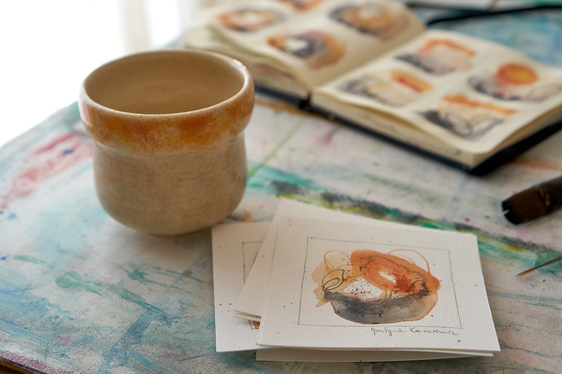 Bonus: oryginalna mini-akwarela autorstwa Justyny Karamuz o wymiarach 9 x 9 cm, z sygnaturą i cytatem z jej dziennika.