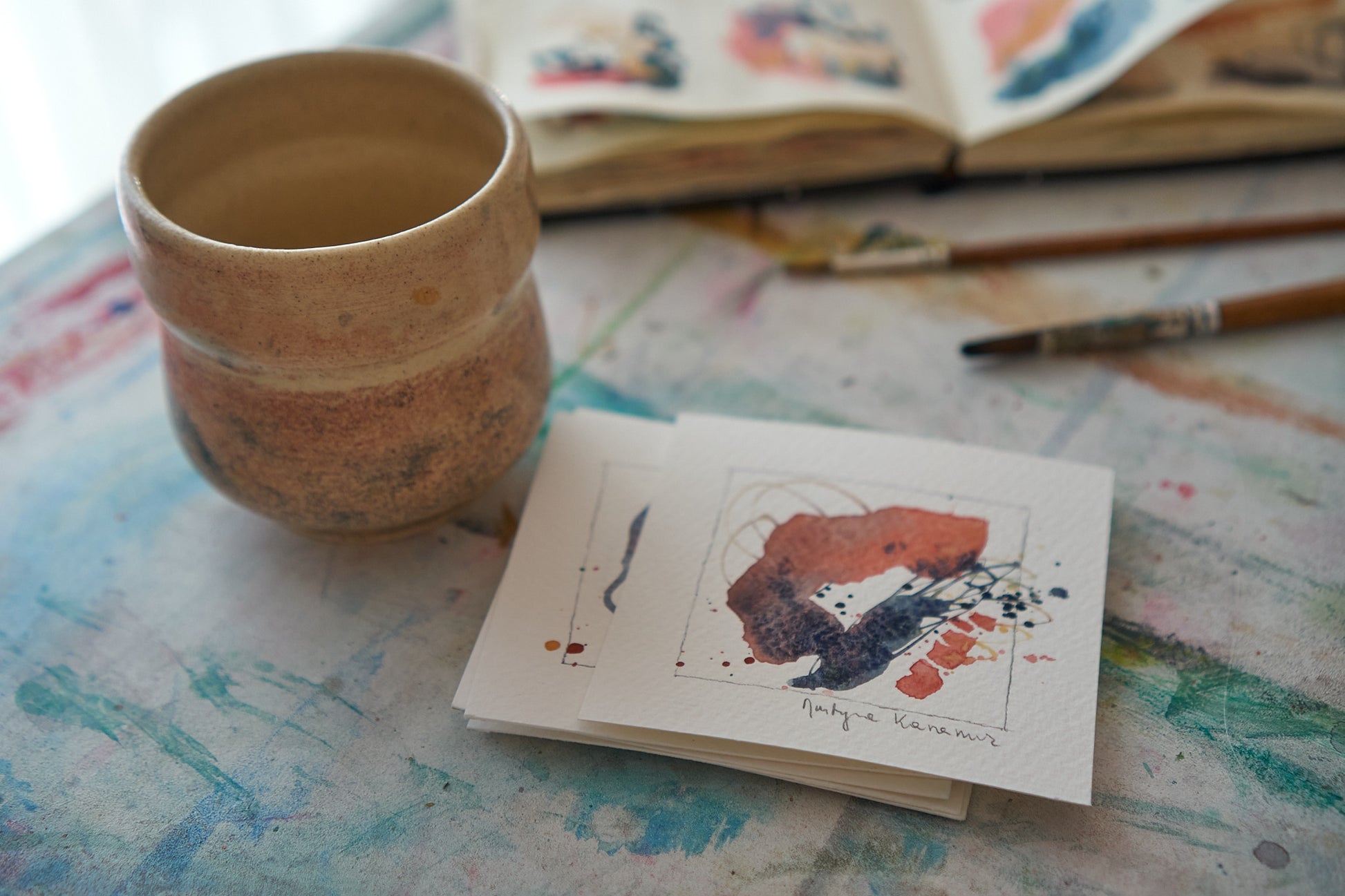 Bonus: oryginalna mini-akwarela autorstwa Justyny Karamuz o wymiarach 9 x 9 cm, z sygnaturą i cytatem z jej dziennika.