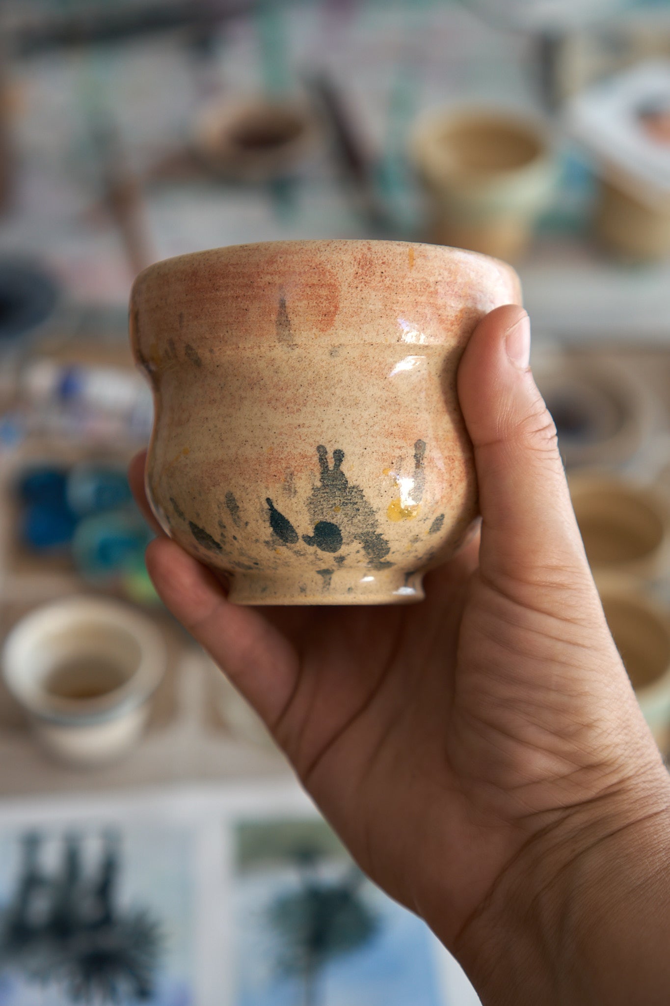 Każda z 20-tu unikatowych czarek została wytoczona na kole garncarskim, ręcznie pomalowana metodą podszkliwną i wypalona na kamionkę w temperaturze powyżej 1250℃.