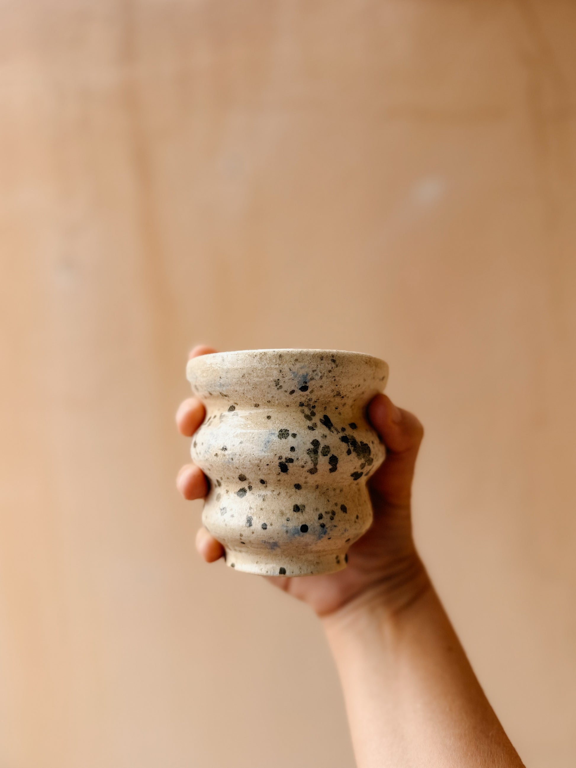 Falista forma czarki, to poszukiwanie kształtu, który idealnie leży w dłoni. Choć proces jeszcze trwa, w jego toku już powstał nowy, wygodny produkt. Ładny, autentyczny, z duszą.